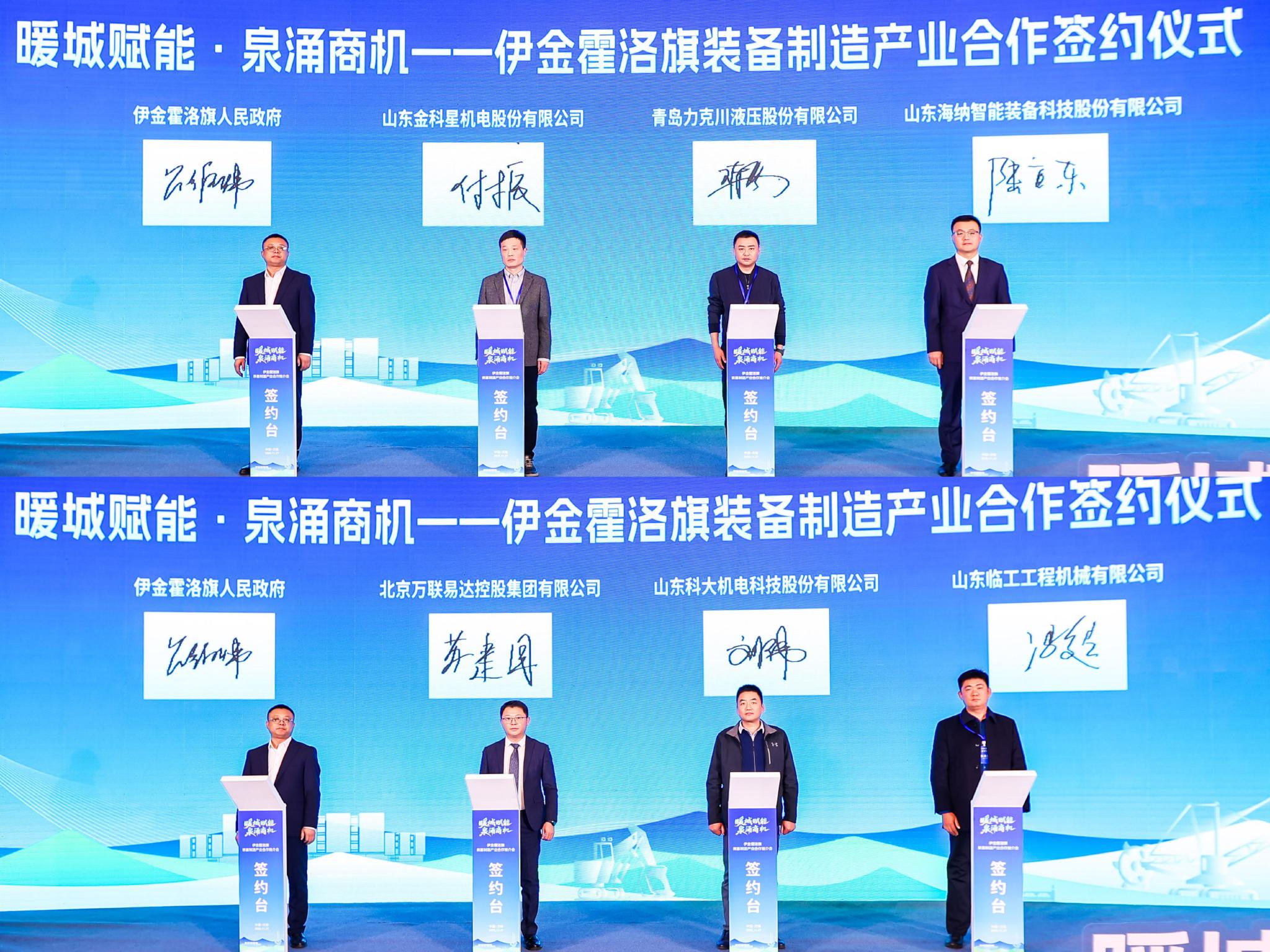 “暖城赋能 泉涌商机”签约仪式将现场气氛推向高潮。伊旗政府与金科星、力克川液压、海纳科技、万联易达、科大机电、山东临工等企业集中签约,签约内容涵盖智能采掘装备供应、矿山运维服务、新能源装备应用、物流配套服务等多个维度,包含技术合作、服务延伸、本地化配套的系统化解决方案。